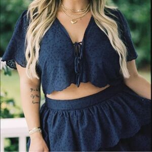 Torrid Belle Isle navy eyelet skirt and matching tie-front crop top. Size 2