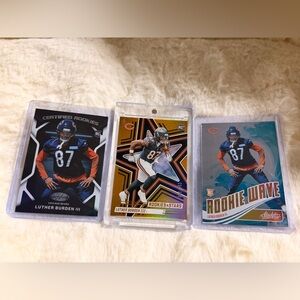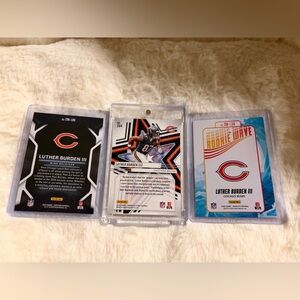 The Panini Luther Burden III Chicago Bears Rookie Card Lot includes three standard-sized sports trading cards featuring the player in his rookie season. Manufactured in 2025, the cards are part of sets like Rookies & Stars Football, Certified Football, and Absolute Football, showcasing Burden in various rookie-themed designs.