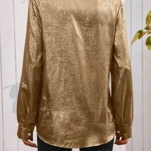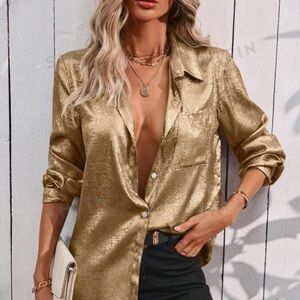 Shimmering gold button down shirt. Long sleeves with a relaxed fit. Perfect for a chic look.