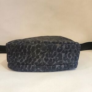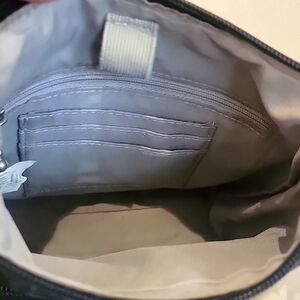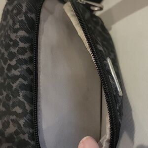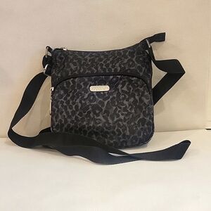 Baggallini animal print crossbody handbag. There is a single compartment with 3 slide pockets and a zippered pocket. There is a zippered pocket on the front of the bag and a slide pocket on the back of the bag. There is a little bit of marking on the silver rings that hold the strap to the bag (see pictures). The bag has a zippered closure. Strap length is 53" in length and can be adjusted. Please see all pictures.