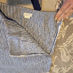 Seersucker crop with navy long ties, the ties loop through back panel, sits at natural waist.