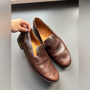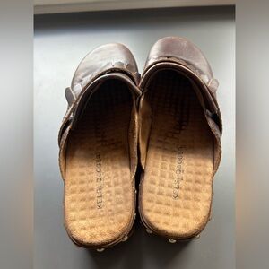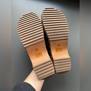 Very lightly worn Kelsi Dagger leather clogs with fringe details. Wooden clog with stud details. Cushioned insole. Size 7.5. Some creasing in the leather. Sold at Anthropologie and Free People.