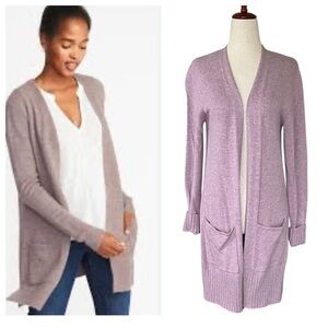 Measures 18 inches pit to pit and 32 inches shoulder to hem. Old Navy open-front cardigan in a light purple color featuring front pockets and ribbed cuffs. In like new condition