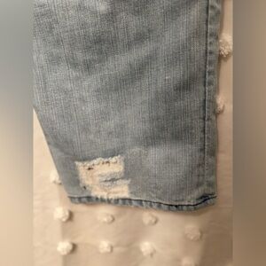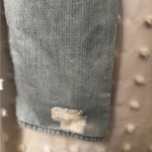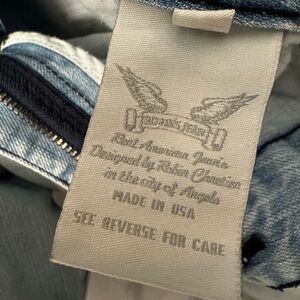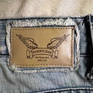 Authentic Robin’s Jean denim featuring the brand’s iconic embroidered wing logo and metal-studded flap pockets. These light-wash jeans have intentional distressing, fading, and light fray at one hem (see photos). Made in the USA with premium cotton denim for a soft, broken-in feel.