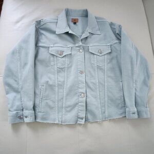 Crafted with a lightweight cotton fabric, this jacket features classic pattern and a short length that makes it perfect for travel and casual occasions. Color light blue. Worn once for two hours, like new. No smoke, no dogs house. The jeans and jacket are the same color and fabric.