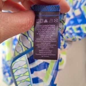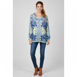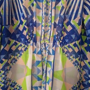 Elevate your wardrobe with this vibrant Hale Bob blouse, featuring a stunning sheer finish and an intricate geometric abstract print in shades of blue, green, and pink. This piece is accented with beautiful hand-beaded detailing at the V-neckline and romantic ruched cuffs with adjustable ties. Perfect for layering over a camisole for a Boho-chic or Resortwear look.