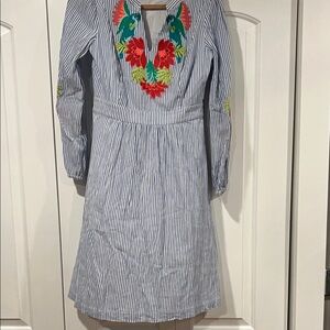 Boden Blue Striped Marla Dress with Floral Embroidery on sleeves and bodice 6R