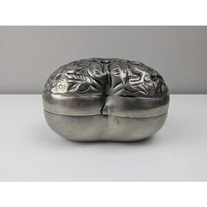 This elegant decorative box by Arthur Court is crafted from silver-tone metal, showcasing intricate floral embossing. The item is in very good condition, with minor signs of use consistent with careful ownership.