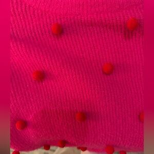 Bright fuchsia sweater adorned with playful red pom-poms. Perfect for a bold, fun look. Good used condition and so cute and festive! It is so soft and fabric is 70% acrylic 27% polyamide 3% spandex