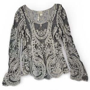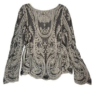 Embroidered Mesh Long Sleeve Top XL Black White Whimsigoth Fairy Boho Floral