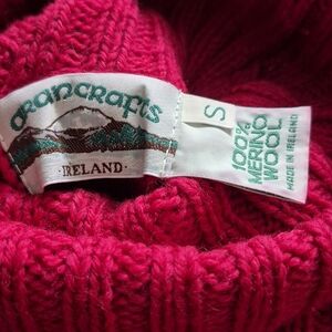 Aran Crafts Beautiful sweater, made from merino wool.Knit with a variety of traditional patterns.Cable, diamond ,basket, stitching.Perfect for warmth and style.Sz.S pit-pit 17.5",2=" long In good pre-owned condition color ruby red Made in Ireland