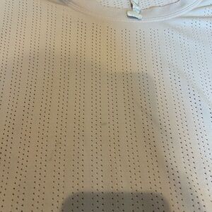 Comfortable wicking fabric with perforated material and slightly cropped fit. Color is a light light peachy pinky color. There are some areas with discoloration marks but they are not obvious when wearing since it is a drapey fit and not skin tight. Lululemon logo is on back left corner and intact. Great piece to add to your althleisure collection. Fits like a size 4