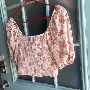 Buckle BKE Floral Front Tie Chiffon Puffy Sleeve Crop Top A. PEACH White Pink M