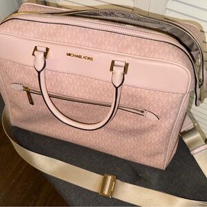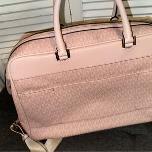 Elegant blush pink carryall by Michael Kors. Gold-tone accents and dual handles. Spacious interior with zip closure.