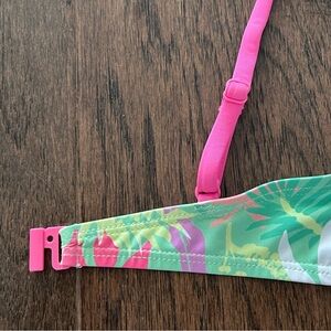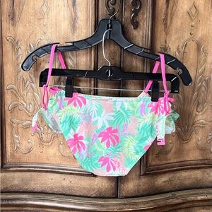 Vibrant kids 2-piece bikini set by Zara. Features a lively floral pattern in pink, purple, green, white, and yellow for a fun, tropical look. Perfect for beach days or poolside fun. Size 11/12.