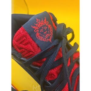 Nike LeBron sneakers in men's size 9.5 are a stylish and functional choice for basketball and casual wear. With a black and red color scheme and geometric pattern, these shoes offer both comfort and performance. Featuring a lace-up closure, rubber outsole, and foam insole, these athletic sneakers are suitable for year-round wear and various activities like running, crossfit, and cheerleading. The low-top shoe shaft style and standard shoe width make them a versatile option for men looking for quality footwear with a colorful and athletic theme.
