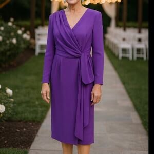Carolina Herrera purple silk midi dress with a sophisticated V-neckline and elegant draped detailing. The wrap-style bodice is artfully ruched and secured with a self-tie knot at the waist, creating a flattering silhouette. Long sleeves and a tailored fit complete this timeless piece.