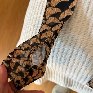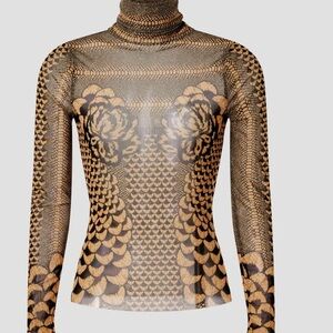 Sexy and in excellent condition. Mock neck with thumb holes and semi sheer mesh fabric. Long sleeves and perfect body con fit that AFRM is known for. Abstract animal / peacock design with black and gold coloring. Perfect for an evening out in any weather! Revolve