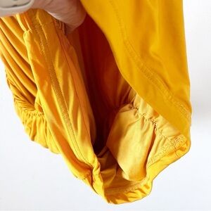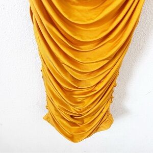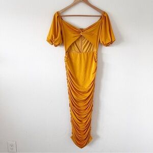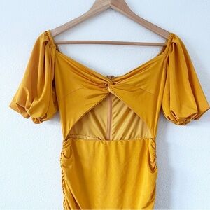 Elle Zeitoune Naira Ruched Off Shoulder Formal in Marigold Gold Midi Dress size XS. Turn heads in this stunning Elle Zeitoune Naira Midi Dress in a vibrant marigold gold hue. This feminine statement piece features an off-the-shoulder neckline, flattering ruching throughout the skirt, soft puff sleeves, and a subtle cutout detail for modern elegance.