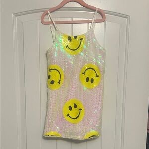 Charming sequin dress with smiley faces. Bright yellow and shimmering white. Ideal for playful outings.