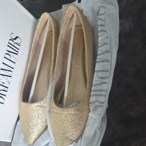 Elegant gold flats with a glittery finish. Perfect for adding shine to any outfit.