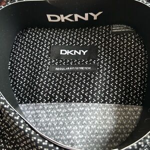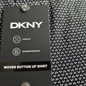 Brand new with tags! Classic DKNY woven button-up in a sleek black with medium gray micro print. Regular fit with stretch for added comfort. Machine washable and perfect for work, events, or a polished everyday look.