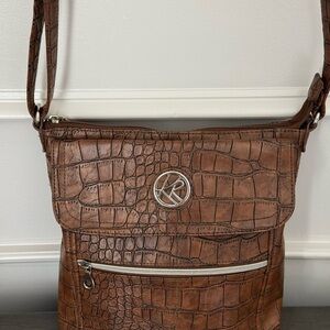 Kim Rogers Brown Crocodile Embossed Crossbody Handbag This Kim Rogers brown crocodile embossed crossbody handbag is stylish, trendy and a fun bag for everyday functionality. Crossbody purse that is compact with enough space to carry all the essentials you need.