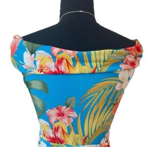 VENUS ~ Vibrant Floral Blue/Yellow/White Off-Shoulder Top w/Circular Accents