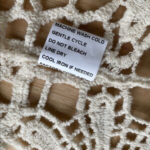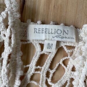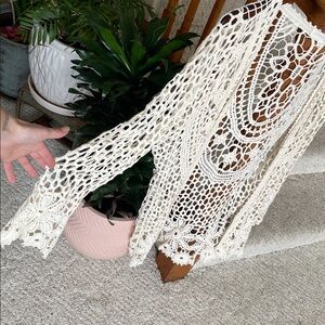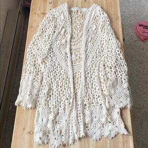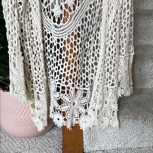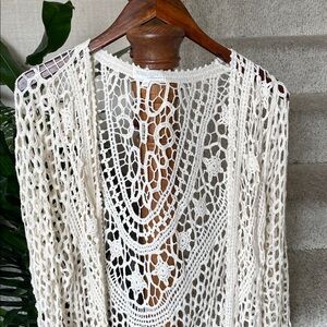Stylish bohemian crochet cream sweater cardigan by Rebellion. Ideal for layering. Great pre loved condition size medium. Cute for layering over casual clothes as a duster kimono, or as a swim cover for a beach day.