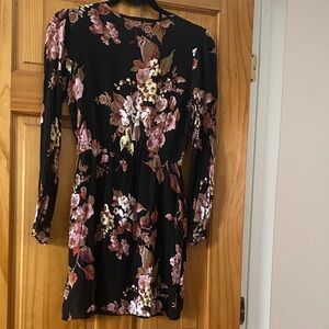 This pretty long sleeve mini dress features a beautiful floral pattern and flattering wrap silhouette. The fabric is a textured crepe with nice drape. Lind at the front of skirt.