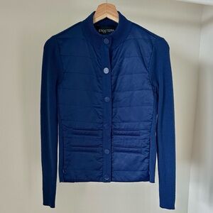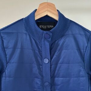 Chic navy puffer jacket by Etcetera. Features button closure and sleek design. Ideal for layering.
