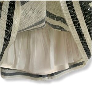 Sequined bebe black & white cocktail dress w/ bold mixed stripes in a flattering fit and flare silhouette with a pleated skirt. Net-trimmed lining adds playful volume to skirt. Bodice has padded bust cups, gripper tape & side boning. Hidden back hook-and-eye zip closure.