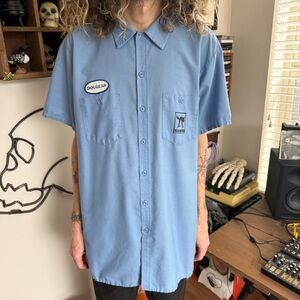 Vintage 90's light blue short sleeve button down Dickies work shirt with the Hellcat Records logo, Douglas embroidered name patch, two patch pockets, left pen holder and in large print on the back Keep Warm With The Gadjits