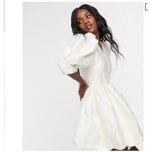 sister jane dress, puff sleeve mini dress, white jacquard dress, bridal shower outfit, elegant wrap dress, romantic style, statement sleeves, vintage inspired, cocktail party dress, modern feminine