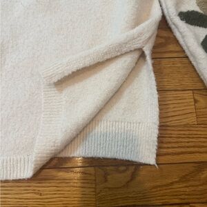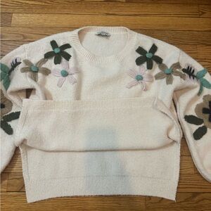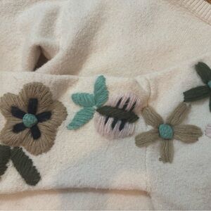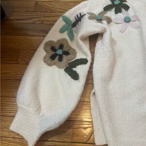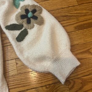 Davi & Dani by Mod Boutique Chic white/ivory sweater with floral embroidered designs on sleeves and just area. Stylish and cozy. Features a bell sleeve design and 5” side slits so it can be tucked in front or back and worn multiple different ways. Women’s Medium pit to pit 19” Sleeve length: 23” fits up to a size large. Very cozy but not overly heavy. Fabric is