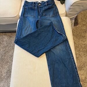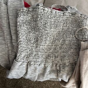 Colors are light wash jean, faded red, brick orange, cream, and black/white stripped.