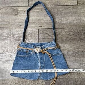 Unique denim handbag styled like a skirt. Features a rope detail and button accents. Perfect for casual outings.
