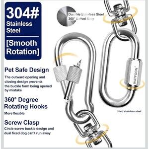 Xtra Strong Stainless Steel Cable --- 65 feet size long, made of stainless steel wire 5mm in diameter with PVC coating, high tensile strength, impact toughness, corrosion resistance, Double crimp for stronger ends, this dog runner large cable has break strength of 1000 pounds.