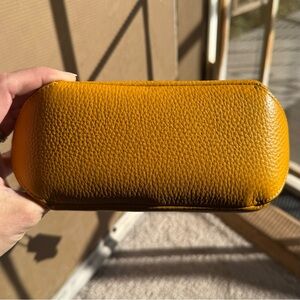 Bag is an adorable sunshine yellow with gunmetal hardware, Turlock closure, adjustable strap, and one internal slip pocket.
