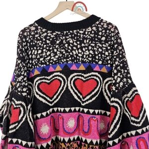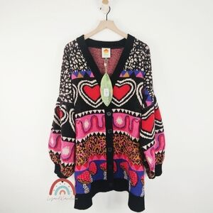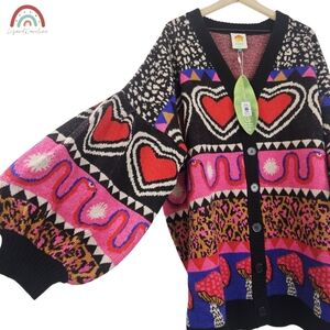 FARM Rio Graphic Elements Ainika Cardigan Mushroom Leopard Cheetah HeartsWool Sweater.
