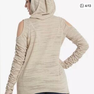 hood & ruched or gathered detailing along the sleeves.