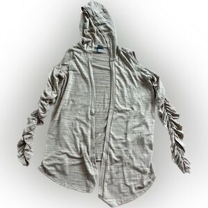 inspired by Rey's Jakku scavenger costume. Key descriptors include cold-shoulder, hooded, ruched sleeves, open-front, drapey, cozy, nerdy-chic, cosplay-friendly, lightweight, and asymmetrical, costume, lightweight