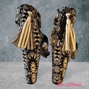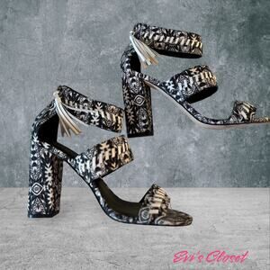Nicole Miller Artelier Miami block heel sandals. The printed canvas uppers feature a geometric pattern with white stitch details and a back zipper closure with tassels, The open toe and 4.5" high block heel provide both comfort and style, These sandals are versatile and can be worn throughout the year, The synthetic outsole and lining material provide durability and comfort, while the high-quality printing ensures the uppers maintain their vibrant colors.