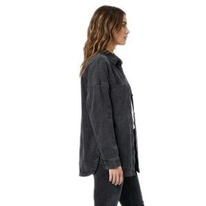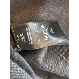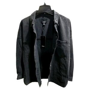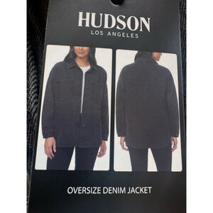 This is a new with tags women's HUDSON Los Angeles oversized denim jacket in black, size M/M. The jacket features a collared neckline, full button-front closure with silver-toned buttons, and two chest pockets with button flaps. It has long sleeves with buttoned cuffs and a slightly curved hem. The fabric appears to be 100% cotton, made in Cambodia, and has a distressed or washed black finish. Care instructions indicate machine wash, tumble dry low, and iron if needed.