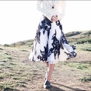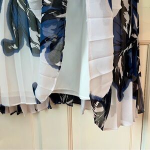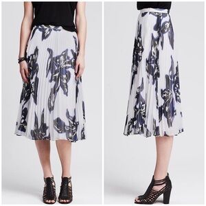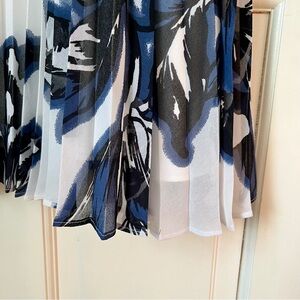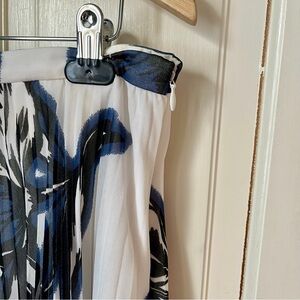 Flawless condition pleated chiffon midi skirt from Banana Republic in a blue, black, and white floral print perfect for spring! 30” waist to hem, 17.5” flat waist. Fully lined. Side zipper.