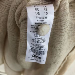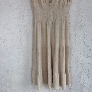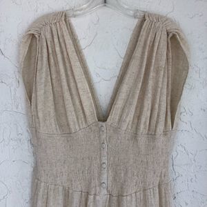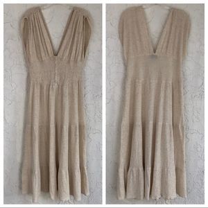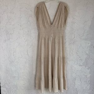 Elegant beige midi dress. Features a deep V-neckline. Soft, flowing fabric. Perfect for any occasion.