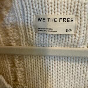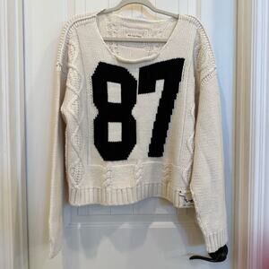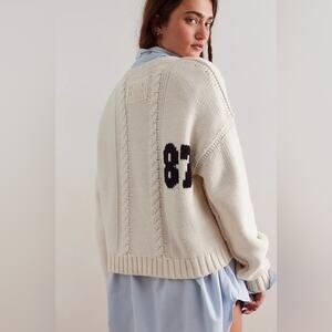 Too-cool in cable knit, this pullover from our We The Free collection is featured in a soft knit fabrication and slouchy silhouette with oversized number detail and drop-shoulder sleeves.