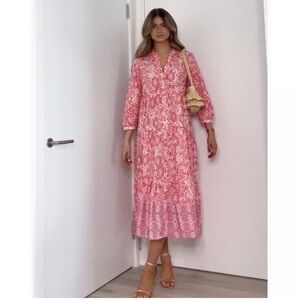 Zara Printed Tiered Midi Dress in pink and white Size XS