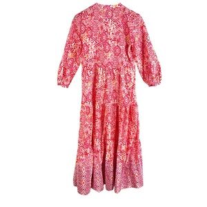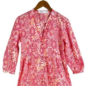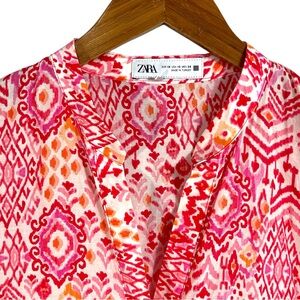 This item is a Zara Printed Tiered Midi Dress, known for its vibrant red and pink geometric, Indian-inspired bohemian print and its Relaxed, Oversized, Flowy Fit.