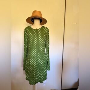 Elegant green dress with white polka dots. Features long sleeves. Ideal for versatile styling.